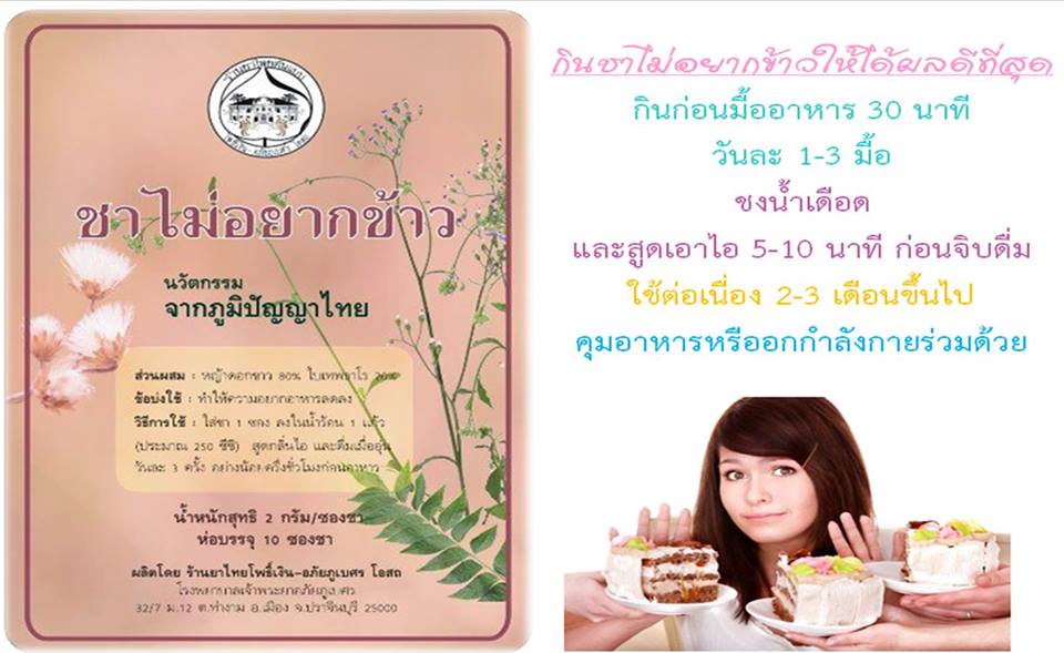แนะนำวิธีใช้ชาไม่อยากข้าวให้ได้ผลดีที่สุด แนะวิธีกินชาไม่อยากข้าวให้ได้ผลดีที่สุด ชาไม่อยากข้าว :สารสกัดจากหญ้าดอกขาวมีคุณสมบัติในการช่วยลดความอยากอาหาร (anorectic agent)– กินก่อนมื้ออาหาร 30 นาที วันละ 1-3 มื้อ - ชงน้ำเดือด และสูดเอาไอ 5-10 นาที ก่อนจิบดื่ม- ใช้ต่อเนื่อง 2-3 เดือนขึ้นไป- คุมอาหารหรืออกกำลังกายร่วมด้วยเสมอนักวิจัยชาวญี่ปุ่นได้ทำการวิจัยในหนูทดลองและในคน พบว่าสารสกัดจากหญ้าดอกขาวมีคุณสมบัติในการช่วยลดความอยากอาหาร …(anorectic agent) ลดค่าดัชนีมวลร่างกาย (Body Mass Index – BMI) โดยมีความปลอดภัยสูง สิ่งที่น่าสนใจคือ ผลในการลดความอยากอาหารไม่มีผลต่อคนปกติที่ไม่ได้มีปัญหาน้ำหนักเกิน โดยในการศึกษาวัดผลหลังการใช้ 4 เดือน พบว่าการสูดพ่นเอาไอของสารสกัดหญ้าดอกขาวปริมาณ 3 มิลลิลิตร จากเครื่องพ่นไอ ขณะนอนหลับ เห็นผลดีกว่าการทานหญ้าดอกขาวปริมาณ 30 มิลลิตร วันละ 2 ครั้ง คือ ก่อนนอน และหลังตื่นนอน อาการไม่พึงประสงค์ที่อาจเกิดขึ้นได้ คือ ปากแห้ง คอแห้ง